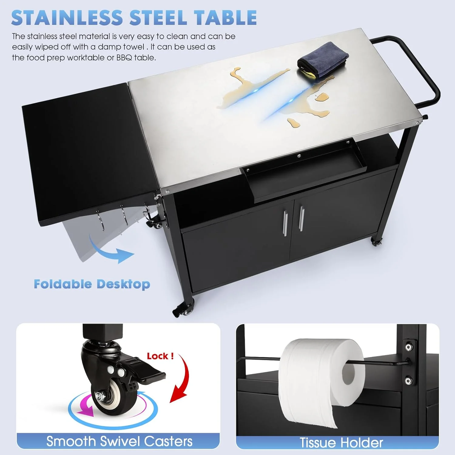 "Outdoor Grill with Lockers, Stainless Steel Pizza Oven Rack Prep Table, Bar Terrace Kitchen Island, 4 Wheels with Brakes"