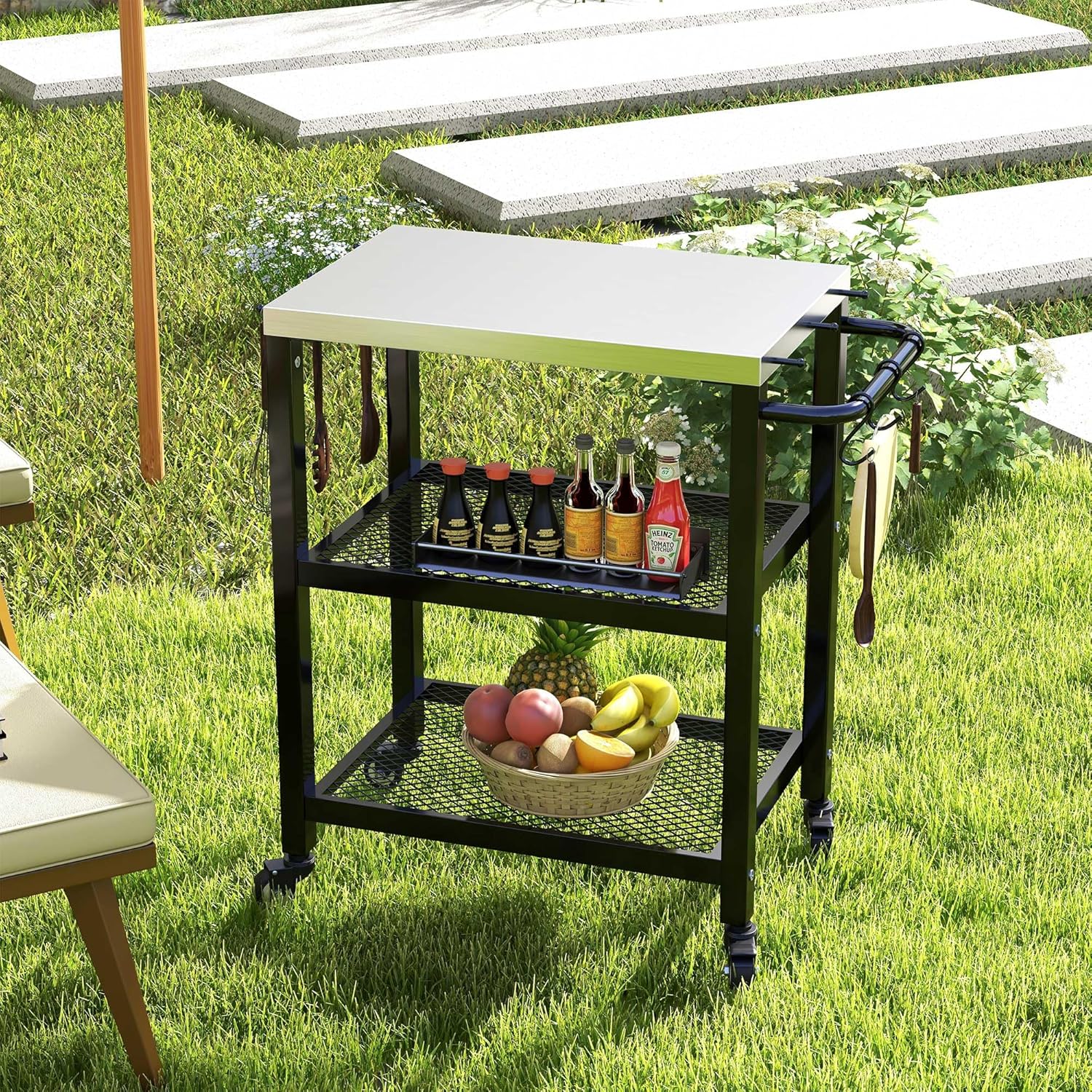 "Outdoor Grill Table with Hooks and Side Handle, Movable Prep Table for Pizza Oven and BBQ, Patio Garden Grill Cart, Silver and Black"